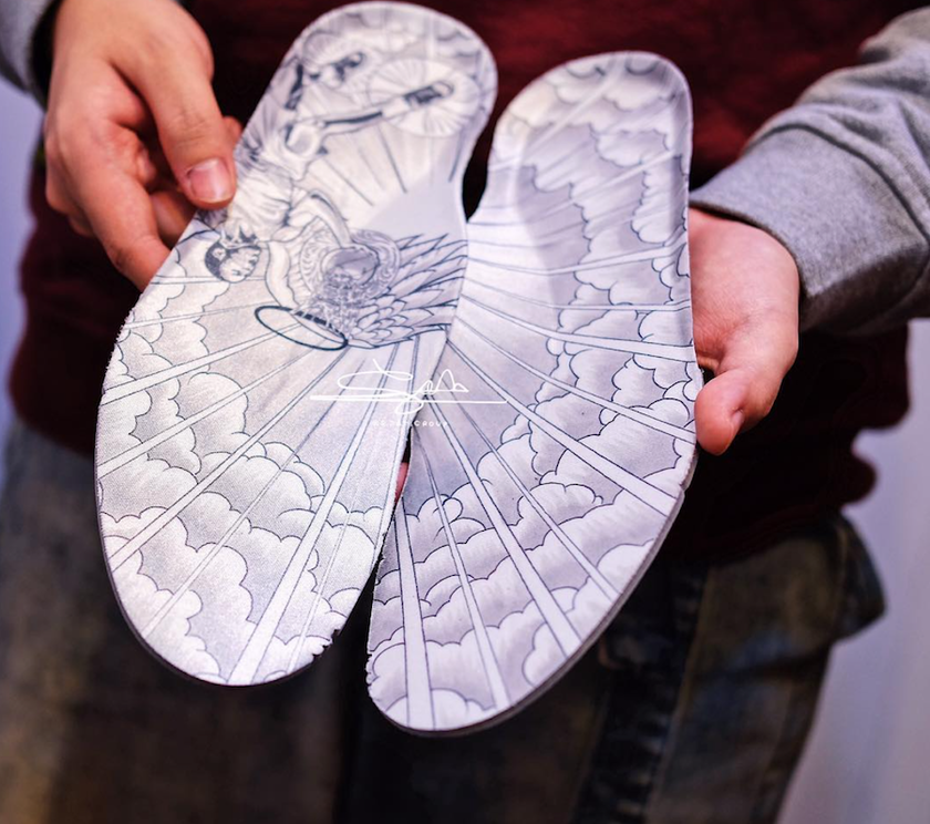 鞋款采用红黑的芝加哥公牛配色,搭配黑红相间的棋盘格的内衬以及大底,具有极强的视觉冲击。鞋垫出印有插上翅膀的飞人插画,直接这次联名主题。