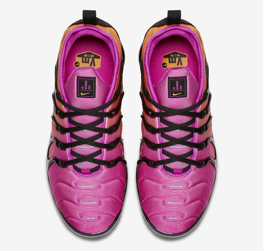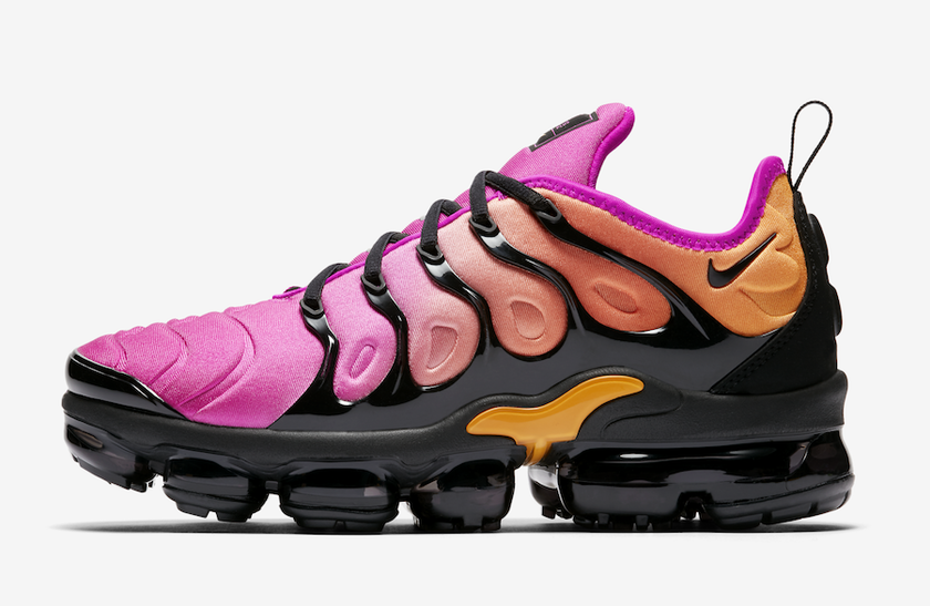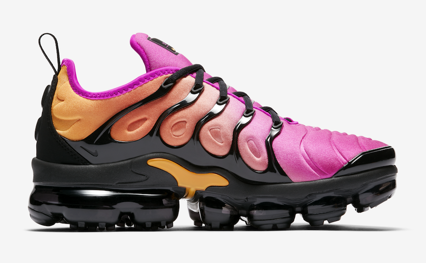Nike 再为革新混血鞋款 Air VaporMax Plus 推出全新渐变配色设计“pink”。其极具流线感的鞋身由明亮的粉色与橙色覆盖,并以渐变的方式呈现,搭配上黑色的鞋侧支架、鞋带以及内衬营造视觉对比,最后搭载上相同色调的 VaporMax 气垫大底呈现。