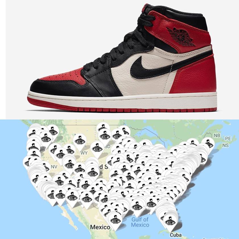 作为2018年推出的全新配色 Air Jordan 1 之一,这双黑红脚趾在曝光之后就积累了大量人气。而近日,美国地区发售店铺图曝光!看到这密密麻麻的发售店铺之后,相信很多小伙伴都长舒了一口气。虽然竞争依旧很大,但不算小的货量总归来说还是个不错的消息。