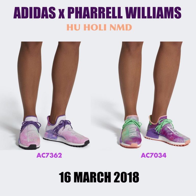 Pharrell 与 adidas Originals Hu NMD 全新 “Holi Pack” 系列中包含两款超梦幻配色,分别是 “Flash Green” 和 “Pink Glow” 。采用了扎染风格,由紫、蓝、绿、橘等色调交织带来强烈的视觉效果。据悉,这两双鞋款确定将于2018 年 3 月 16 日正式发售,售价 250 美元。