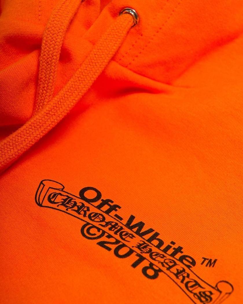 Off-White 日前再度与银饰品牌 Chrome Hearts 展开联乘企划,带来了一件巴黎独占的全新连帽衫。将黑色 Chrome Hearts 签名式 Logo 与 Off-White:tm: 及 :copyright:2018 字样点缀在胸前与背后。