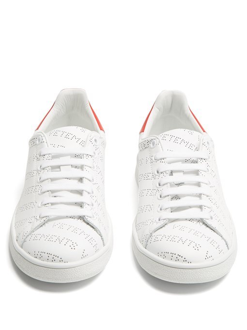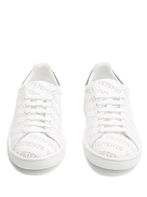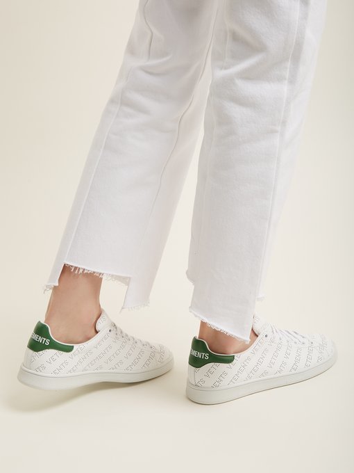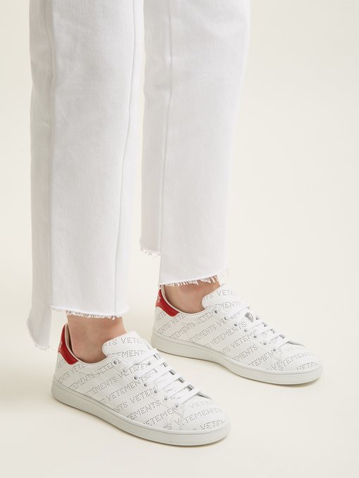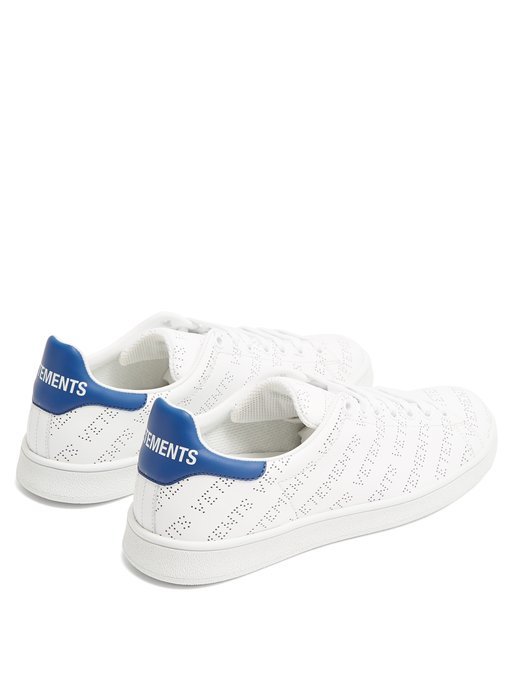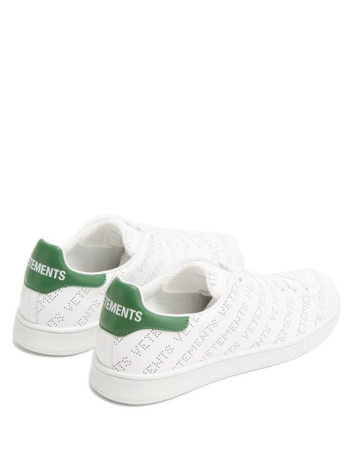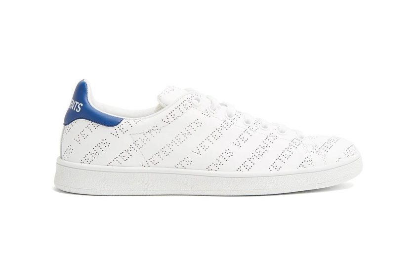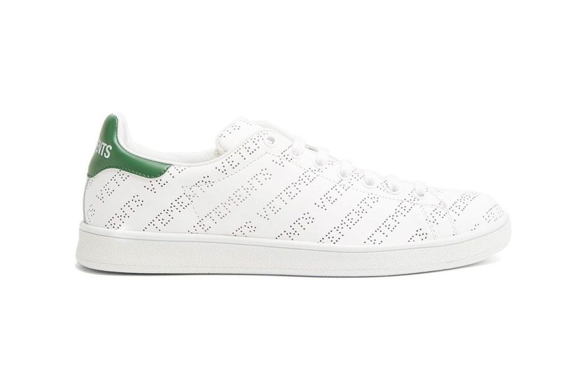 Vetements 推出极具复古风格的运动鞋,以经典白色为主色调,鞋尾分别有绿色、红色和蓝色。该鞋履由意大利厂商制造,采用穿孔皮革制成,鞋底采用厚实橡胶鞋底,鞋身则有其品牌字样的镂空设计。喜欢的朋友可前往 MATCHESFASHION.COM零售店 购买,零售价为 755 美元。