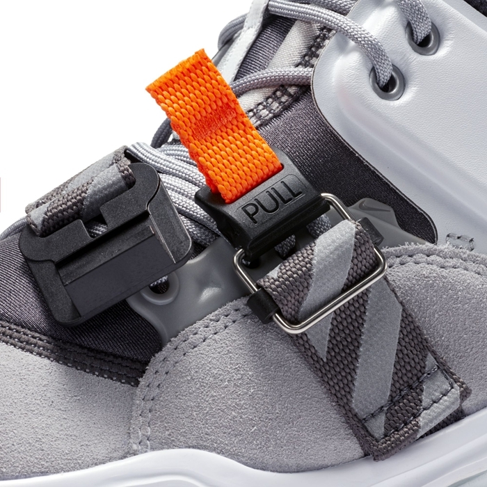 鞋款整体以灰色为主调,除了鞋面融入麂皮材质外,独特的绑带也加入条形 3M 反光材质,再加上橙色点缀,颇有一种 OFF-WHITE 联名既视感!将于 3 月 22 日正式发售,感兴趣的朋友请继续关注。