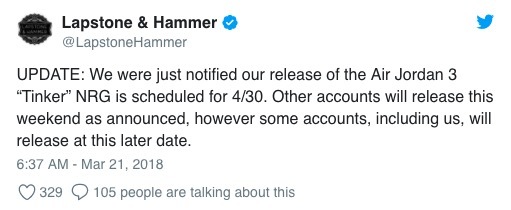 随着时间的推移,距离 Air Jordan 3 “Tinker” 的发售日期也是越来越近。但近日有传闻称,Air Jordan 3 “Tinker” 将被部分店铺将推迟发售!