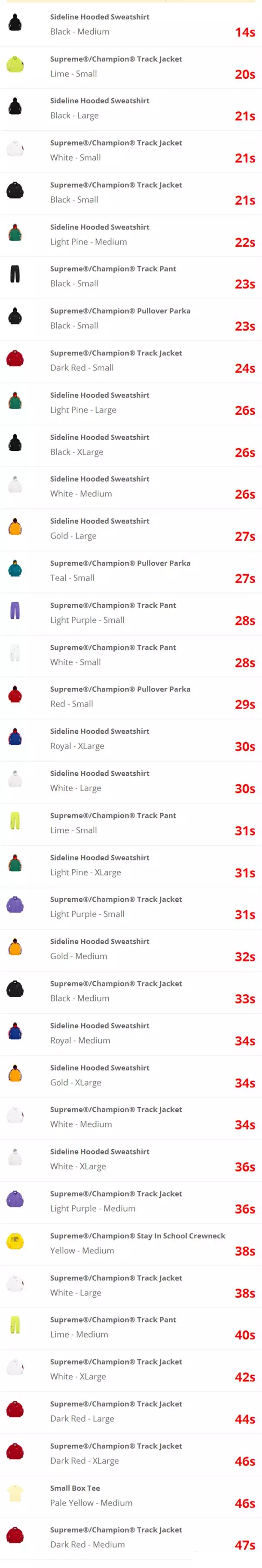 本周虽然没有重磅高规格的联名发售,但是Champion联名的的销售表现仍旧不俗,但最终赢家依旧是Supreme“麒麟臂”黑色,14秒抢完稳定week5榜首,5个颜色在34秒内售罄!