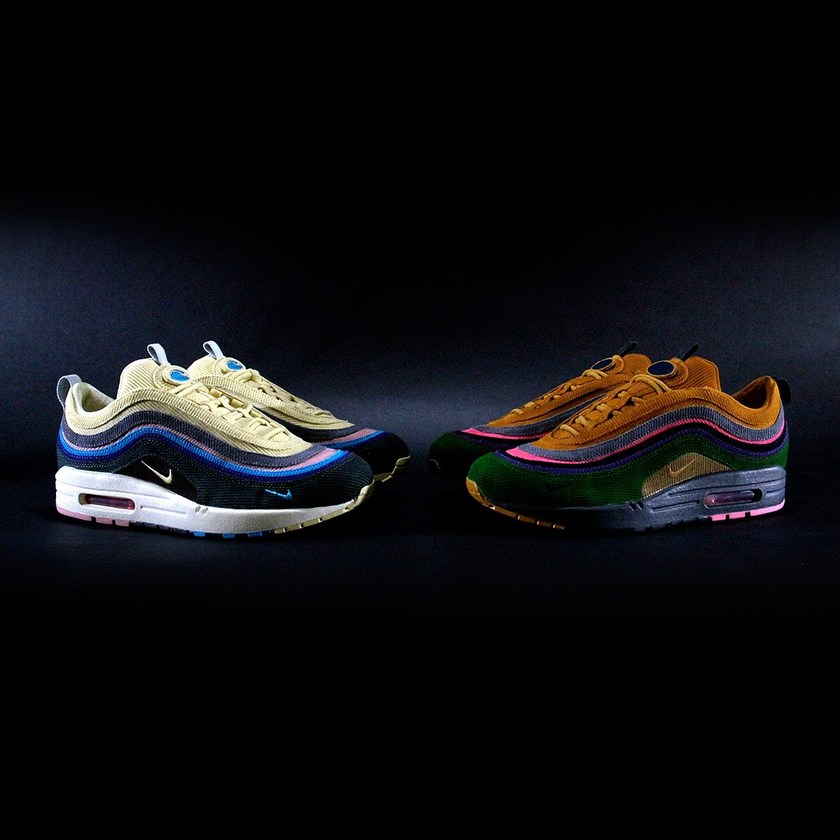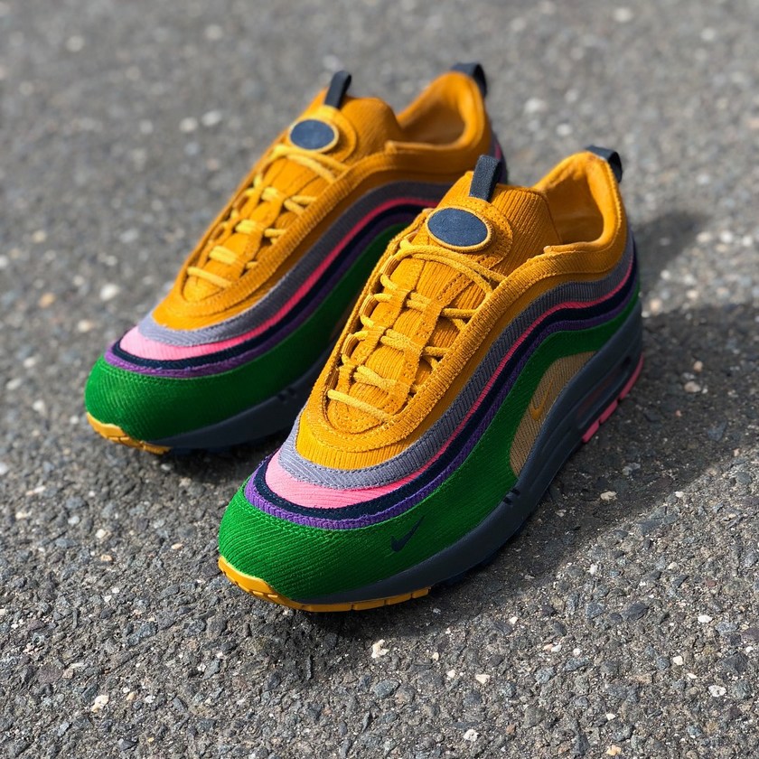 知名鞋店 Concepts 以“Air Max Night”为主题,并携手球鞋客制专家 Mache 打造了一款特别版本的 Sean Wotherspoon x Nike Air Max 1/97。从 Concepts 创意总监 Deon Point 发布的照片可以看出,改版本将鞋款原有彩虹色灯芯绒鞋面颜色加深,此外鞋舌魔术贴、后跟鞋提与中底也改以黑色呈现,以此迎合“夜晚”主题。