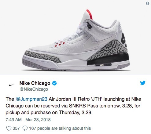 与上两次不同的事,这一次芝加哥站采用的是线上预约的方式。芝加哥地区的 Sneakerhead 可以在美国时间3月28日通过 Nike SNKRS 抽取 Air Jordan 3 JTH 的购买权,然后于次日29日前往芝加哥地区指定鞋店进行购买。