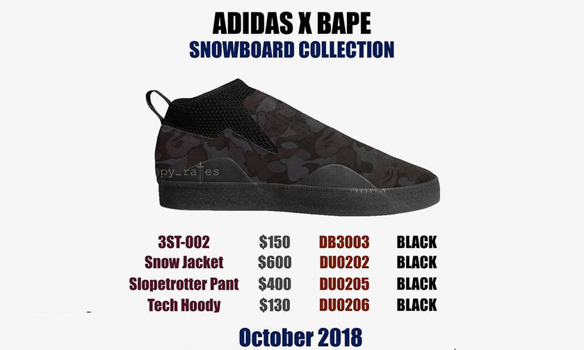 adiads Originals 和 A BATHING APE 的关系在近两年可以说是相当亲密,虽说双方在今年的首次联名才刚刚发售没多久,但各路爆料账号已经迫不及待的开始曝光后续的合作了。早前在看过双方将会带来一双 Samba 联乘鞋款的消息后,今天爆料账号 @py_rates 又曝光了双方或将带来一个名为 Snow Board 的联乘系列,并称会推出鞋履、雪山服、帽衫以及裤装等单品,目前而言我们还不能确定此次系列将会以怎样的形式呈现,感兴趣的朋友与我们一起期待单品的曝光吧!