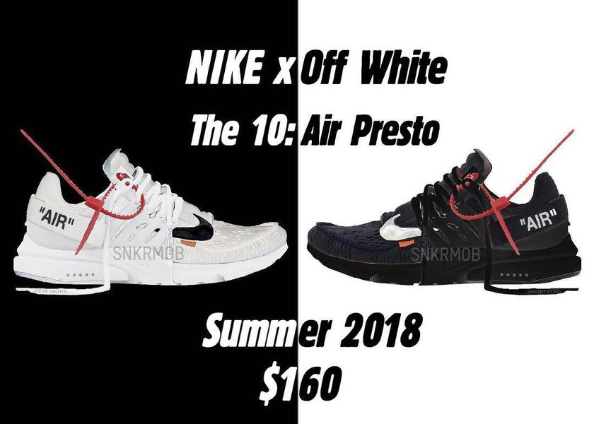 除了此前曝光的银灰版本 OFF-WHITE x Nike Air Presto 外,爆料账户 @snkrmob 再度曝光OFF-WHITE x Nike Air Presto白、黑两款全新配色!看来今年的联名是不止10双这么简单了。