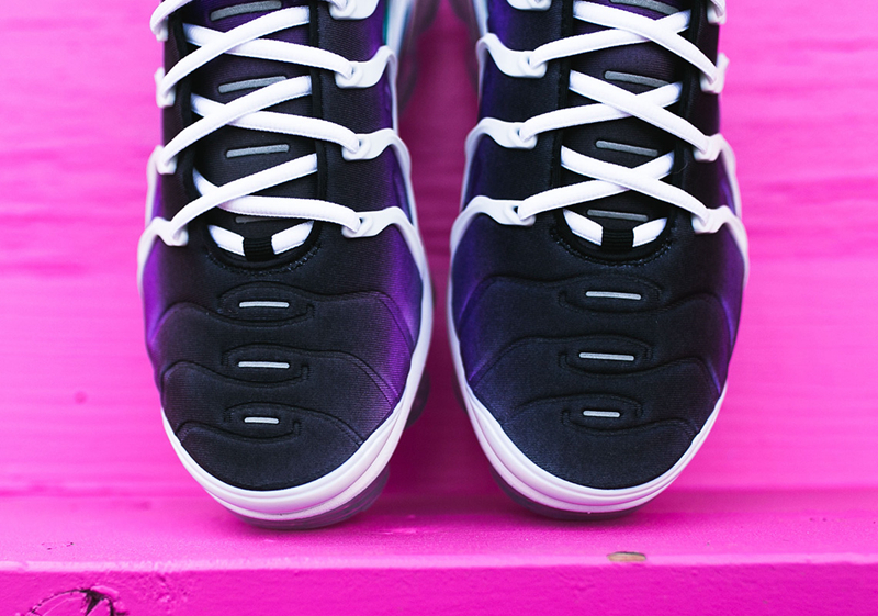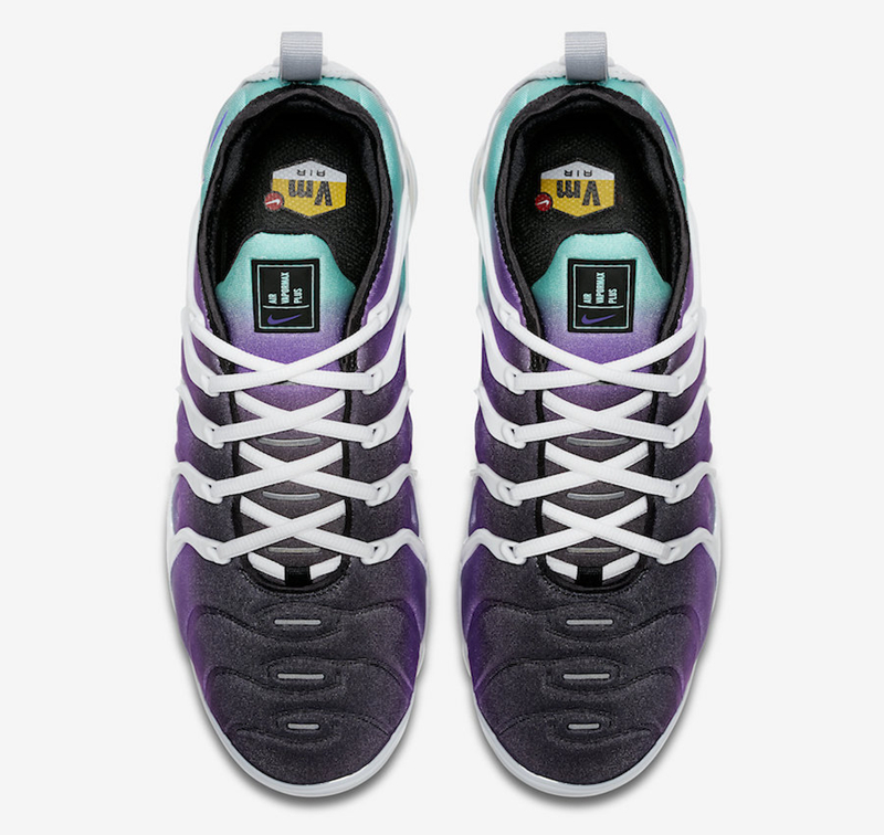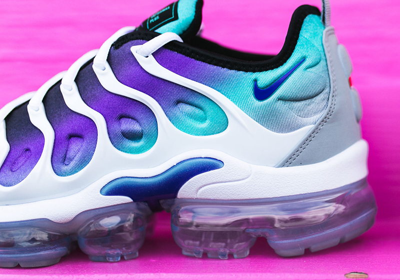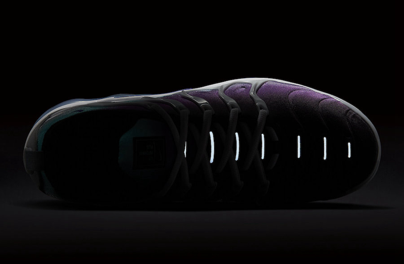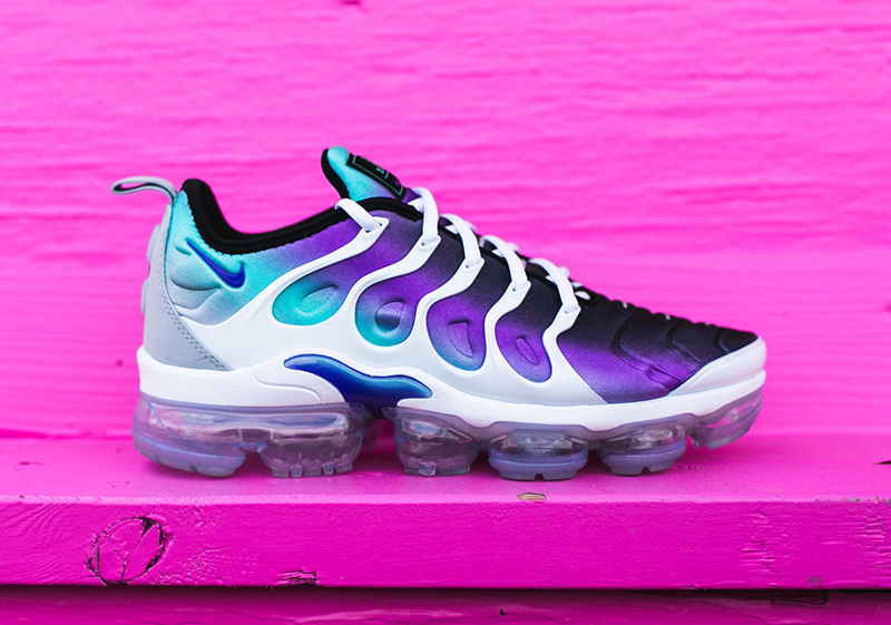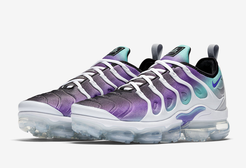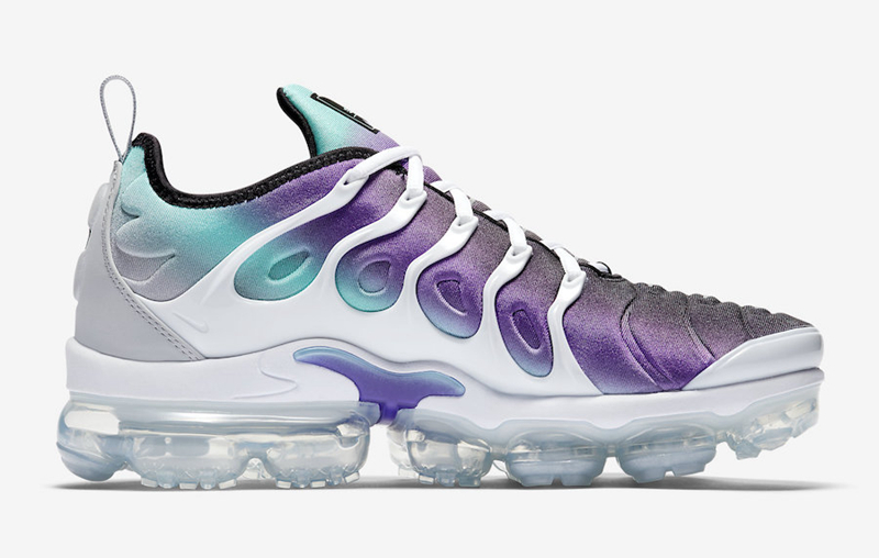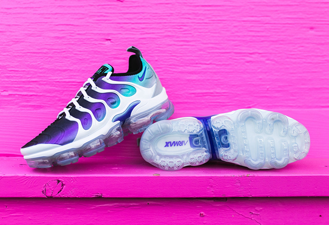 Nike Air VaporMax Plus 作为NIKE今年主推的鞋款,此番又将推出一款非常梦幻的葡萄紫渐变配色。鞋面从绿色渐变为紫色,搭配白色的笼状支撑结构和透明气垫,同时添加发泡层的中底使鞋款比普通 Air VaporMax 更加柔软,可以带来不俗的视觉效果及舒适的上脚体验。