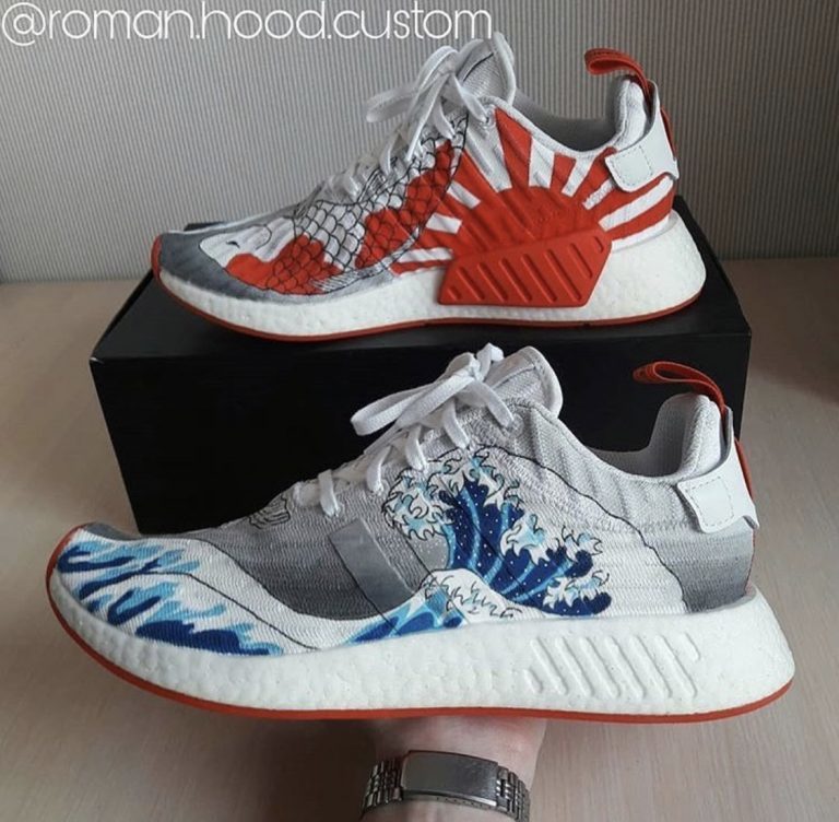 近日,网络上出现了一双由网友DIY打造的充满浓郁东洋风格的 adidas NMD CS2 Custom 。以最为明显的日本文化符号太阳旗、锦鲤、海浪等图案,通过手绘的形式赋予在一双白红的 adidas NMD CS2 OG 配色之上。如今网络上球鞋客制服务已经相当成熟,不知道这样的设计是否能给大家在定制球鞋时提供更多的灵感呢?