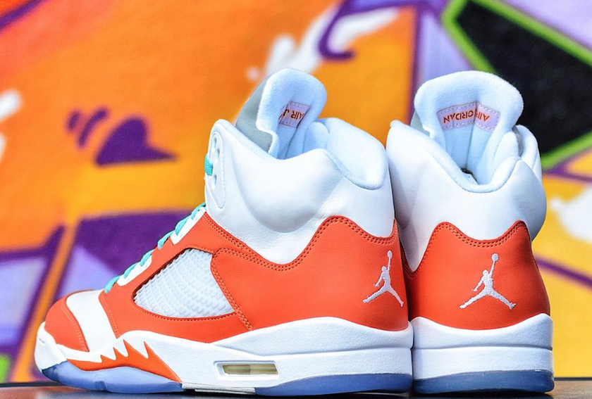 据悉,这款 Air Jordan 5 “PRFC” 是以安东尼旗下足球队 Puerto Rico Football Club 为设计灵感打造而成。鞋面采用白橙撞色的设计,搭配葡萄紫、天蓝、浅灰等细节,清爽亮眼,极具辨识度!鞋舌上舍弃了5代常用的 Jumpman Logo,转而采用 “PRFC” 的 Logo 呈现,彰显其独特身份。