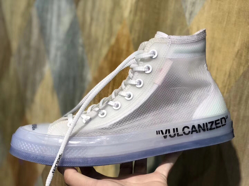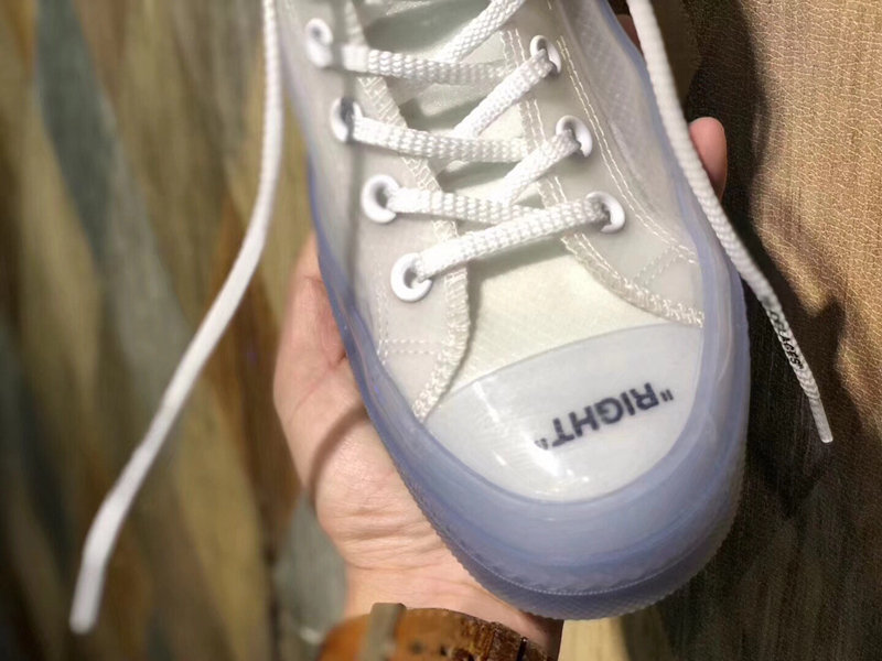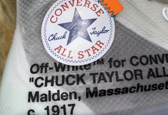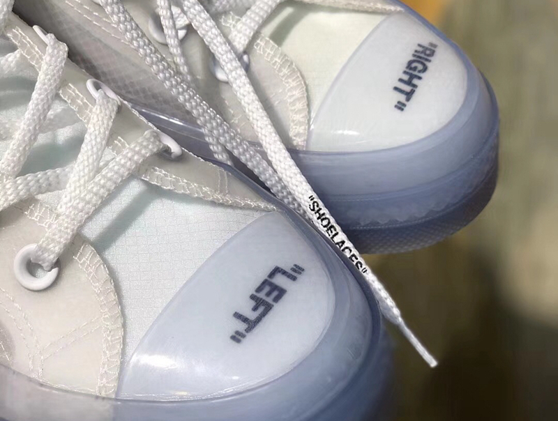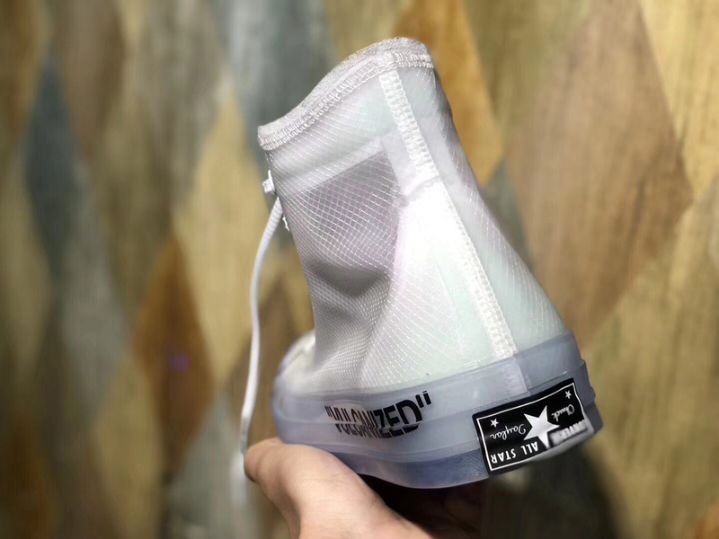 OFF-WHITE x Converse 即将于下月发售,此番带来更多实物细节谍照。以经典的 Chuck Taylor All-Star 作为蓝本,延续了 OFF-WHITE 联名系列字体标注、橙色标签和防盗扣等诸多细节,鞋面以独特的轻薄透明织物打造,带来独特的视觉效果。