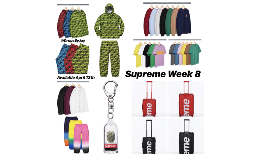Supreme 18 春夏第 8 周重点应该在与 RIMOWA 联名行李箱上。除此之外还将发售 3 色 “World Famous” 防水冲锋衣和配套的长裤、Ganesh 贴标卫衣、工装夹克、与羽绒服配套的渐变色长裤,以及两款 T-Shirt 和仙人掌钥匙链。