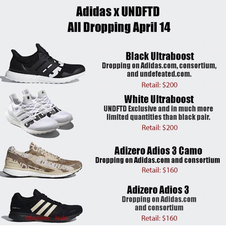 此次联名系列鞋款将于 4 月 14 日一齐上架发售,UNDEFEATED x adidas UltraBOOST 每双售价 $200 美元,UNDEFEATED x adidas Adizero Adios 3 每双售价 $160 美元。该系列联名服饰部分或将一同上架发售。