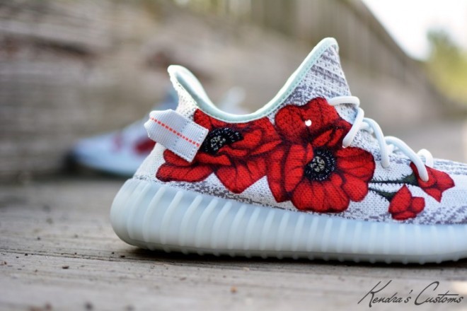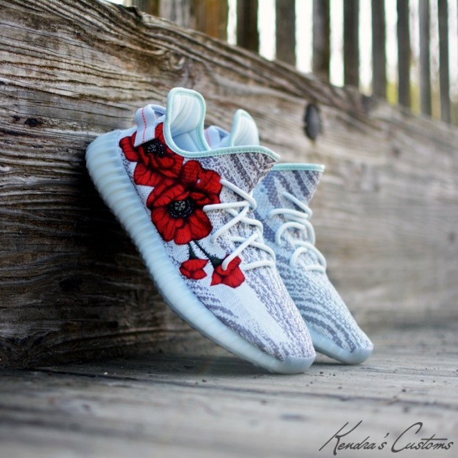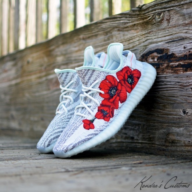 adidas Yeezy 350 V2“Blue Tint”配色中文名为“可燃冰”,也是为定制设计师们提供了灵感。此番网上又有全新作品曝光,在冰蓝色的鞋面上,于标志性的SPLY-350“油漆条”处绣上了4朵大小不一的鲜花,在有限的鞋面空间营造了春天群芳争艳的氛围。鲜红的花瓣与鞋身清爽的冰蓝色相搭配,给予了人们别样的视觉体验。