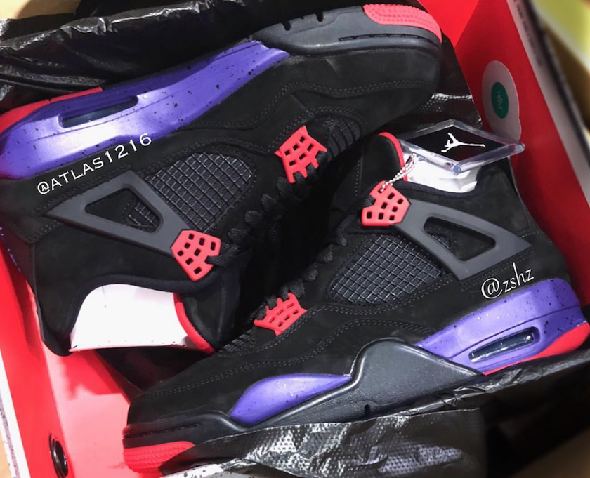 此番 “Raptors” 配色采用类似 Air Jordan 7 “Charcoal”,也就是被鞋圈熟知的AJ7猛龙的色调,以经典的黑、红、紫三色将主题呈现。黑色的麂皮材质鞋面搭配红紫二色细节,极具视觉冲击!是继 Air Jordan 5 GS “Raptors” 之后的又一精品猛龙配色!