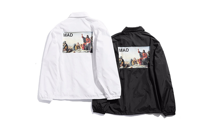 由高桥盾打造的概念店铺 MADSTORE 一直都在服装、配饰等方面延续着这位设计师的美学理念,今季UNDERCOVER 便为 MADSTORE 推出了一组独占系列,各种样式的 “MAD” 字样彰显出这家店铺的专属身份。产品包含长、短袖 T恤、卫衣以及教练夹克,其中的瞩目单品当属背后印有复古油画的两款夹克。色彩方面也以 UNDERCOVER 爱用的酒红、黑白、蓝色为主。如果你喜欢这组产品的话,除了到 MADSTORE 店内购买,更可通过 ZOZOTOWN 在线选购。