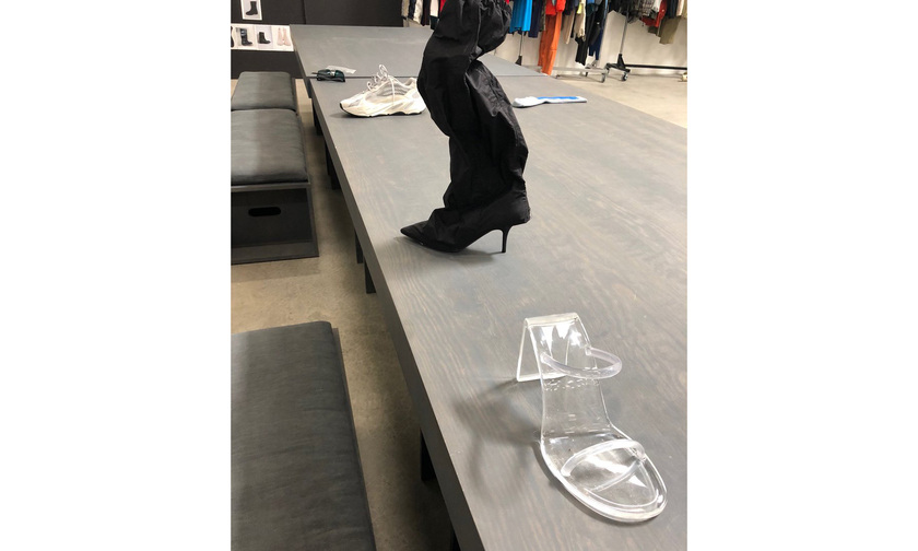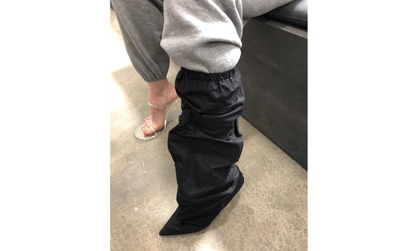 另一双则是超级夸张的高跟鞋,侃爷为之命名 “Track pants boots”,使用尼龙面料打造的超级高筒靴,像是将 Track Pants 反过来穿一般,可能只有 Kim Kardashian 可以驾驭了。就让侃爷的曝光来的更猛烈些吧!