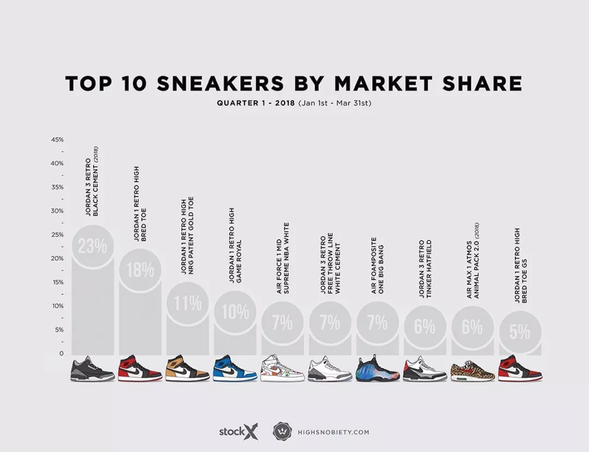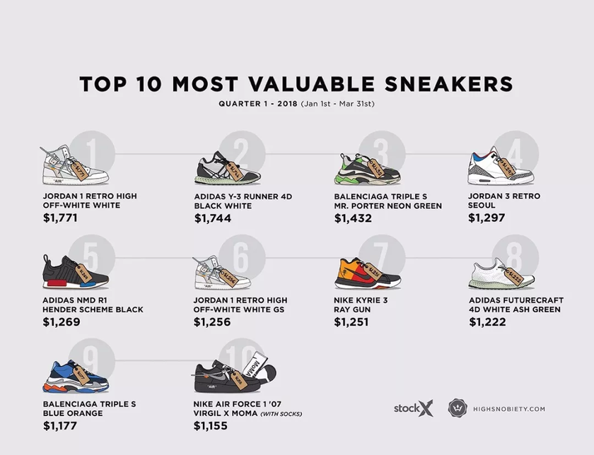 近日,时尚潮流网站 highsnobiety 携手球鞋交易平台 StockX,基于 StockX 平台在 2018 年第一季度(从 1 月 1 日到 3 月 31 日)的实际销量数据,带来了第一季度高端鞋款(非平价鞋款)中, “最贵的 10 双” 和 “市场占有率最高的 10 双”排行榜。