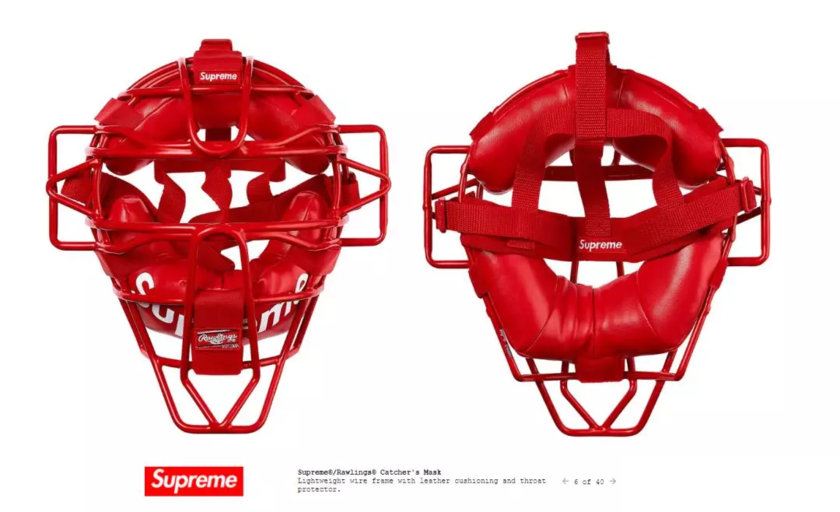 本周除了Supreme x 《猛鬼追魂》电影联名系列的发售外,Supreme 还将与 美国品牌Rawlings,中文音译作“罗林斯”进行联名合作,其中将包含面罩等单品。