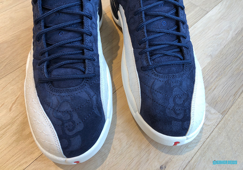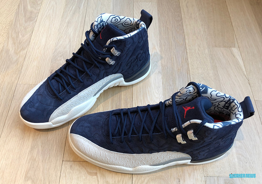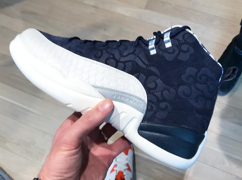这款 Air Jordan 12 选用极具日系特点的海军蓝与纯白配色,海军蓝麂皮鞋面与白色内衬上布满祥云图案,而白色皮革部分则以鱼鳞纹理呈现,搭配后跟的 “Air Jordan” 的日文细节,细节满满,极具日系风情!