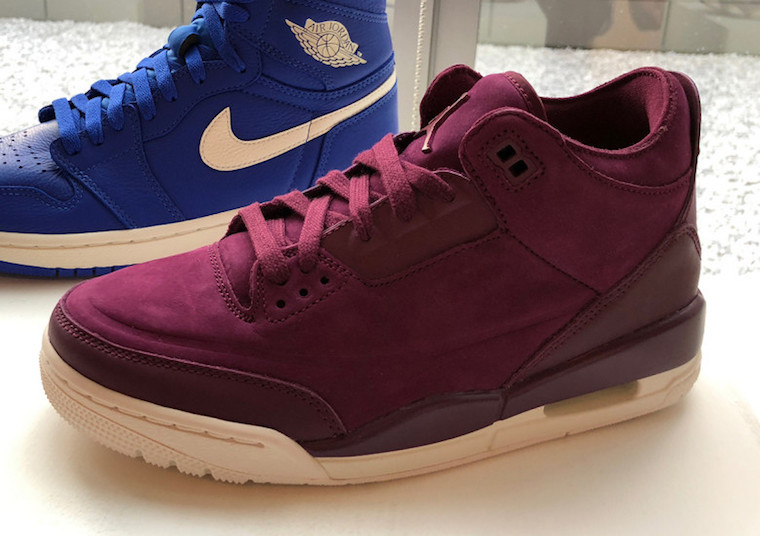 这款 “Burgundy” 配色鞋面采用酒红色调的麂皮材质,同时舍弃了3代标志性的爆裂纹设计,转而辅以同为酒红色调的优质皮革为点缀,营造出与平常3代完全不同的质感。