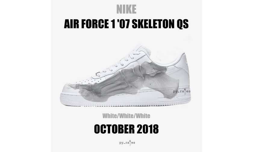 据爆料账户 @py_rates 透露,一双设计非常“特别”的 Air Force 1“Skeleton QS” 将要登场。从预览图中可以看到,其整体以纯白色为基础,最大的特点莫过于贯穿整个鞋身的骨骼图案,可以说十分吸睛。另外,据悉这双 “Skeleton QS” 将会在今年 10 月正式登场,喜欢它的朋友们,再耐心等待一段时间吧。