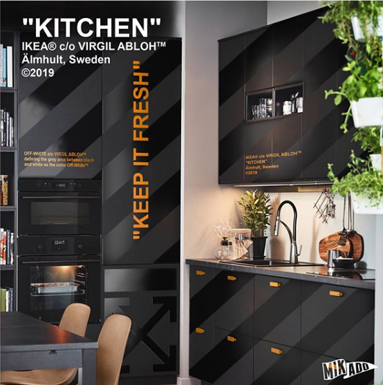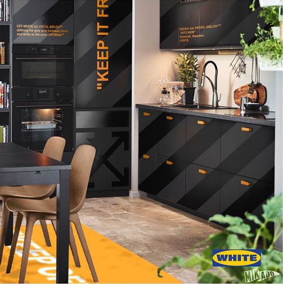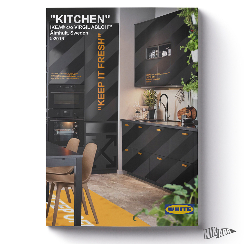 虽然目前双方还在设计改良阶段,暂无发售日期释出,但设计师@mikadololo 已迫不及待的为我们假想出未来 OFF-WHITE 融入家居的画面,并设计出我们熟悉的宜家宣传册,左上角的 OFF-WHITE 字体与右下角的联名新 Logo,更是脑洞大开颇为用心。