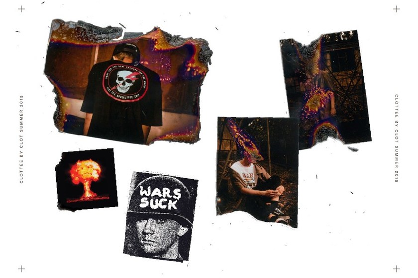 由 CLOT 主理人 EDC 及 KP 共同开发新创意的 CLOTTEE BY CLOT,本年度便以「Apocalypse」为其系列主题开首,承接上一季的「Department of Connection」系列。是次系列从《Apocalypse Now》电影中获得灵感,让大家能够大致了解世界末日到来的样子。并参考一个世界在无政府的状态,当中图案包含影射核武器,战时用具等等,并讲述主角独自留在地球上,反映失落和孤独感。有关整个 2018 夏季「Apocalypse」系列,将于 5 月 16 日起陆续抵达 CLOT 天猫旗舰店、CLOT 官方网站、各 JUICE 门店。