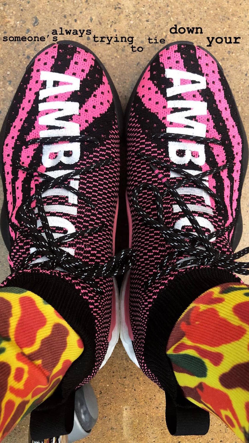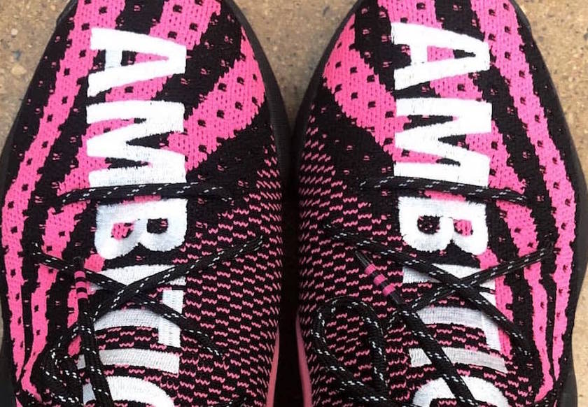 这款菲董联名鞋款以 adidas 最新开启的 BYW 系列为设计蓝本,采用类似 Yeezy 350 与 adidas Hu NMD 相结合的鞋面设计,以骚气的黑粉纹路与纯白 “AMBITION” 刺绣将设计呈现。