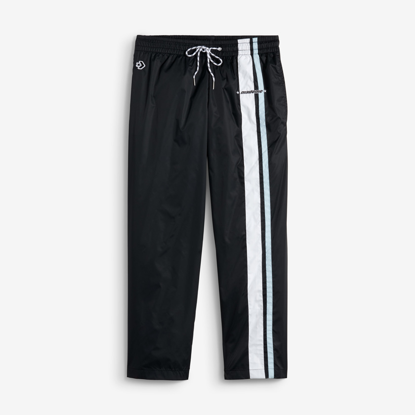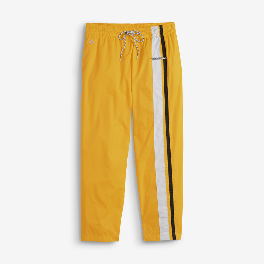 开边裤腿上饰有双色赛车条纹织带,裤子上饰有织纹腰带拉绳和刺绣的 MadeMe 与 Converse 星箭标志。
