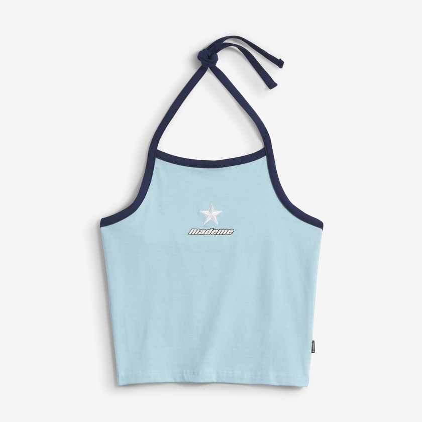 充满律动感和反差感的运动装让整个系列统一起来,夹克兜帽和侧片开边袖上饰有双色赛车条纹织带,胸部缝饰有一颗星星。