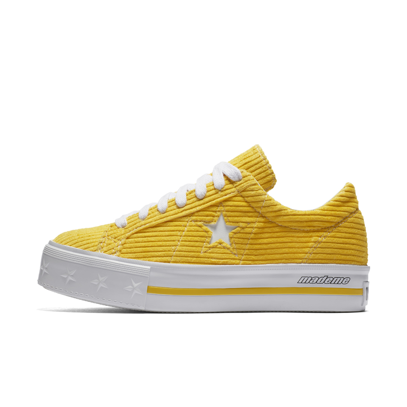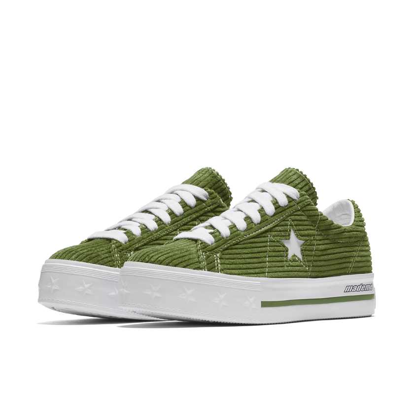 One Star 鞋款,以90年代夜店潮人视角为灵感,采用水洗绒和六条纹灯芯绒打造鞋面。厚底鞋款均饰以 MadeMe 标志性图案、高档鞣革羊皮、山羊皮鞋领及帆布内衬,配宽棉布鞋带。