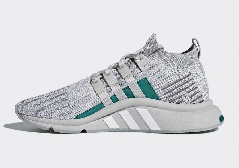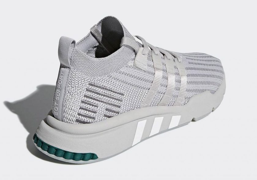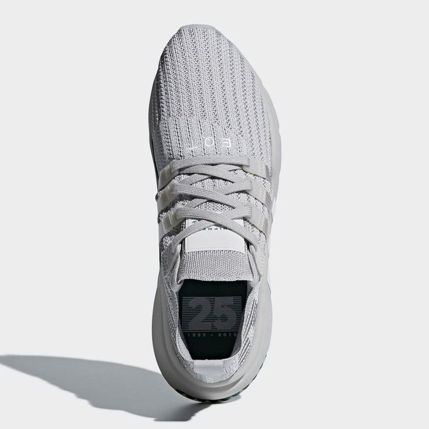 鞋身采用 Primeknit 材质打造,以素雅的浅灰色呈现,同时搭配灰色 ADV 大底,整体和谐统一。在鞋尾和鞋身内侧加入绿色点缀, adidas EQT Support 系列的特征性元素在此得以体现。鞋款在鞋垫处有一个 “25” 字样,以此纪念 EQT 系列诞生 25 周年。