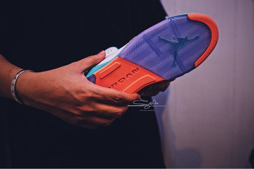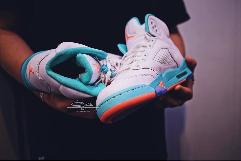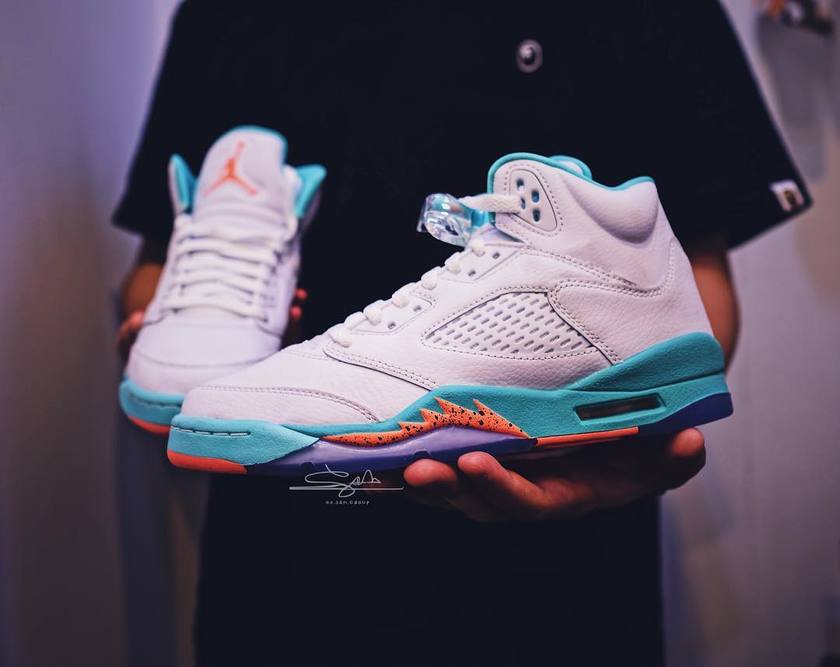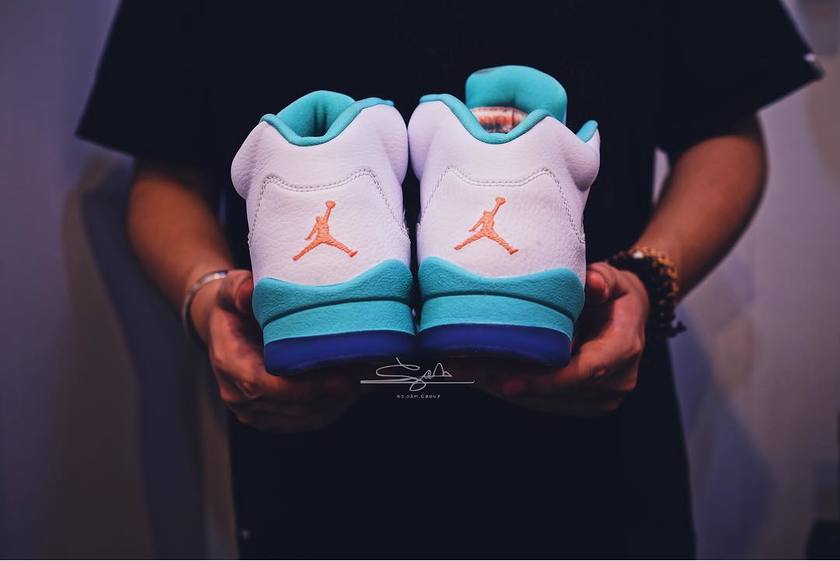 此番 Air Jordan 5 GS 鞋面以纯白为基调,内衬以及中底则以 Tiffany 蓝装点,搭配显眼的橙色鞋面细节以及淡紫色半透明大底,配色极为清爽亮眼!