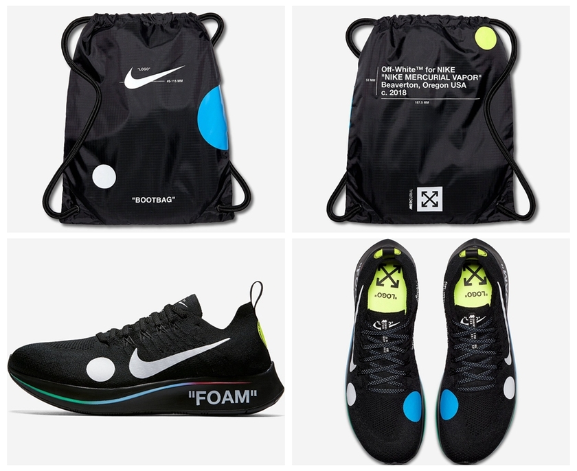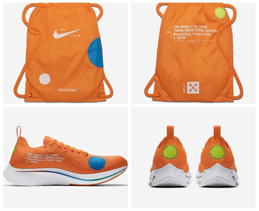 14号发售的Off-White x Nike Zoom Fly Mercurial Flyknit 也在今日释出了官方图集,并配有细节满满的 “BOOTBAG” 收纳袋。