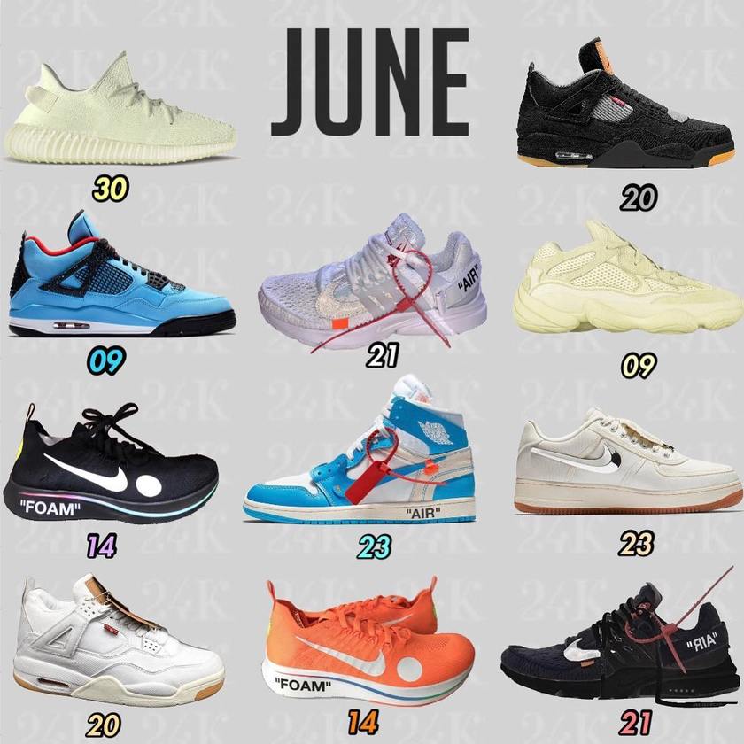 下面就通过一张图,让你纵观整个 6 月的重磅发售(鞋款下方数字是日期)。