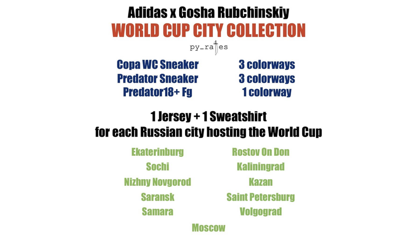 Gosha Rubchinskiy 早前已经宣布同名品牌停止运营,不过在即将迎来俄罗斯世界杯之际,Gosha Rubchinskiy 还是将与 adidas Originals 展开合作,推出一个名为 “World Cup City” 的足球主题联名系列,这一系列将为包括莫斯科、加里宁格勒、圣彼得堡等 11 座世界杯比赛举办城市分别推出一件球衣和一件卫衣。除此之外,还将带来以 Copa WC Sneaker、Predator Sneaker、Predator18+Fg 等三款鞋型为基础的联名鞋款。