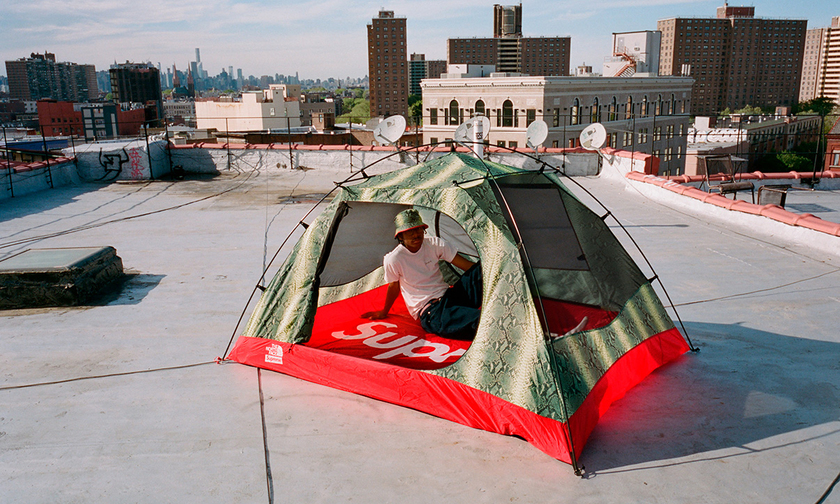 同时,为了更切合 THE NORTH FACE 的户外传承,联名系列中全部单品均经过机能处理:比如教练夹克是用 2.5 层尼龙结合压胶剪裁,轻便透气且具有极佳防水性能;旅行包和背包则用 30D 防水防爆尼龙材质打造;最重磅的 Stormbreak 3 帐篷是用 68D + 75D 涤塔夫制造,坚固稳定且相当轻便。