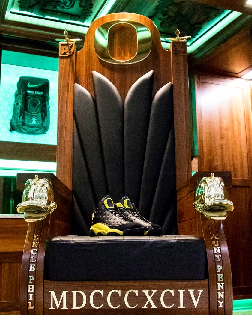 而这次除了 Air Jordan 13 “Oregon Ducks” PE 释出之外,俄勒冈鸭队还释出了一把霸气外露的 “Oregon Ducks” 专属王座!“O” 字 Logo 造型的头枕,羽毛形象的靠背,加上金色鸭头造型的扶手,奢华、霸气、且同样具有辨识度,令人过目难忘。