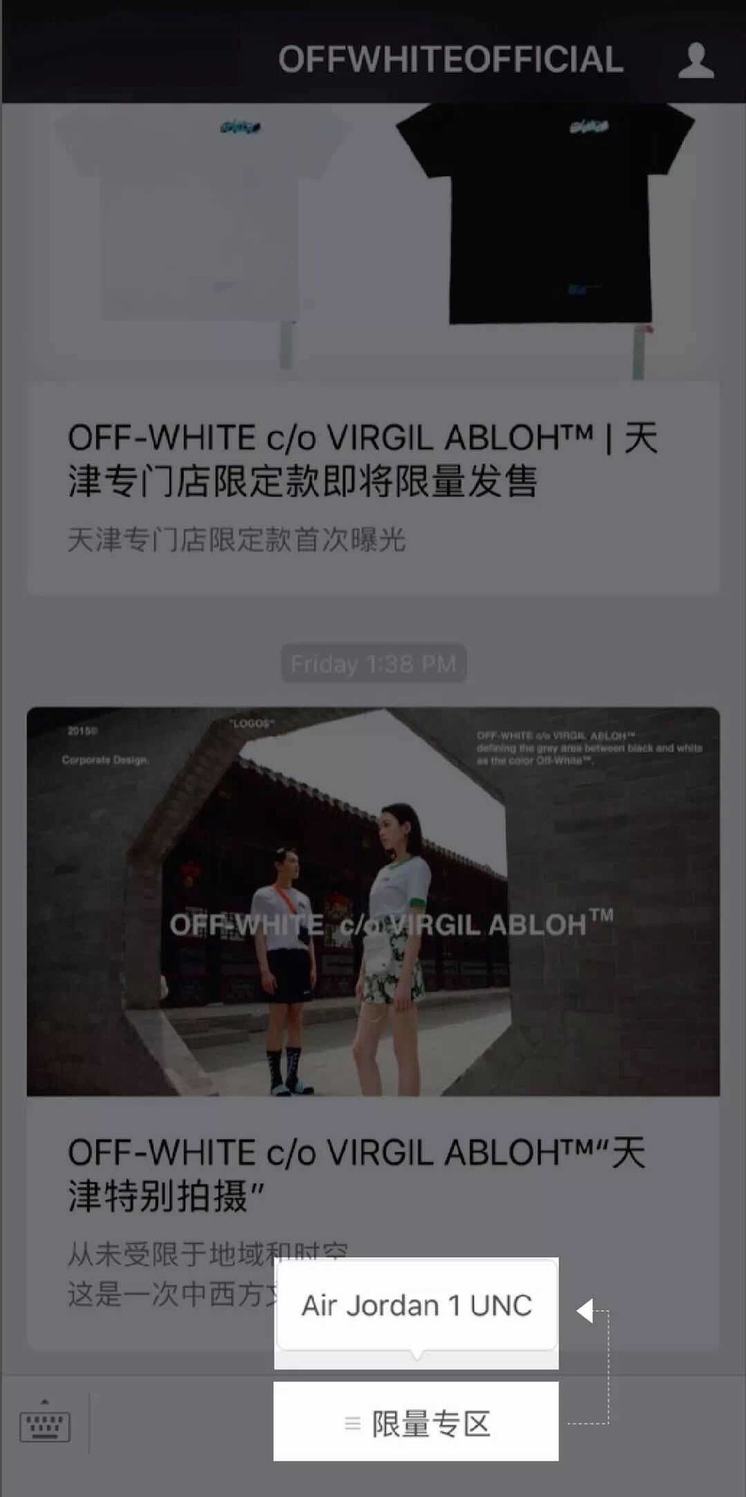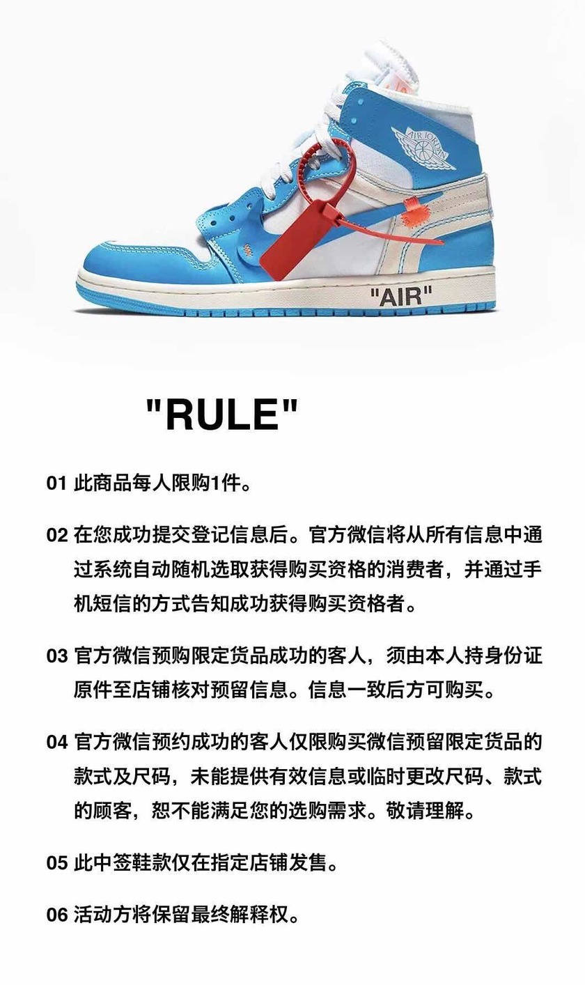 今天,虽然国内耐克官网 Off-White x AJ1 "UNC" 迟迟还未公布发售信息,但是今天 Off-White 国内官方公众号“突击”发了一个抽签消息!