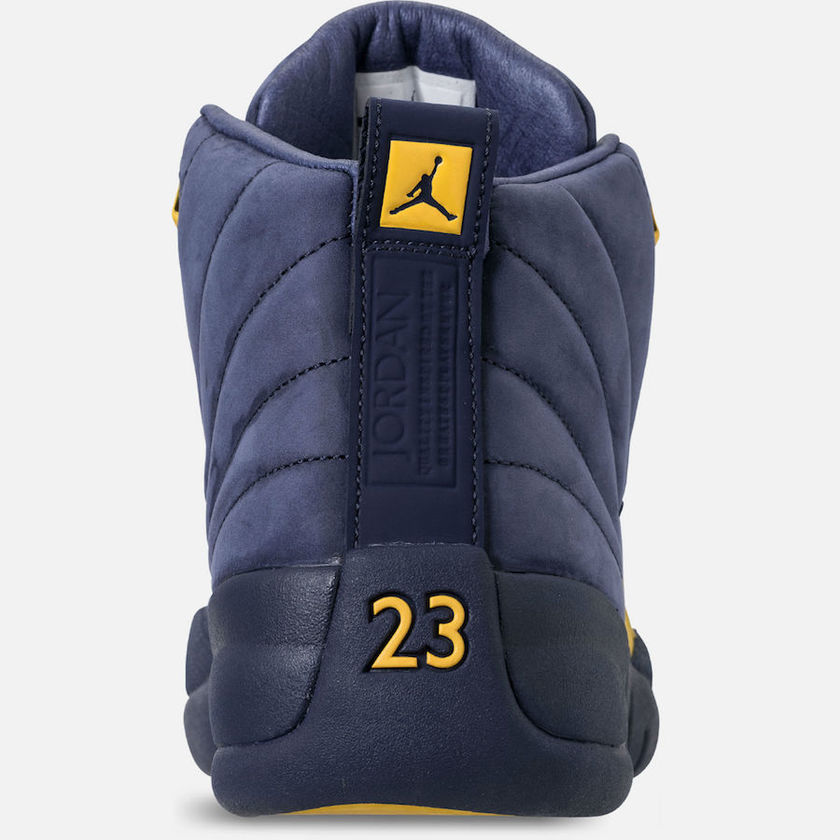 这款 Air Jordan 12 “Michigan” 从配色到细节设计上都与 PSNY x Air Jordan 12 “Michigan” 联名极为类似。同样采用海军蓝的麂皮鞋面,鞋舌也同样以 “M” Logo 和 Jumpman Logo 的不对称设计呈现。此番市售版 “Michigan” 配色相比 PSNY 联名外观上仅仅少了双色内衬以及后跟鞋提,整体而言已经称得上诚意满满了。