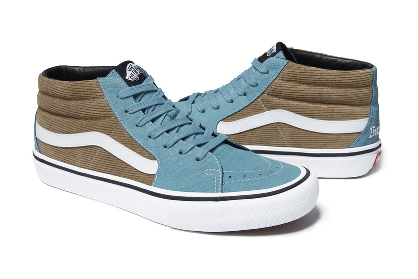 此次双方本次选择以中筒 Sk8-Mid 和比较冷门的 Lampin 为蓝本出发,而设计上均选用优质鳄鱼压纹麂皮,结合撞色灯芯绒材质制作鞋身,共带来黑/绿、橙/紫和蓝/棕三款不同配色,而衬里和鞋垫也都采用最为优质的皮革材质呈现。除此之外,Sk8-Mid 和 Lampin 还分别在后跟与鞋舌绣有哥特字体的“Supreme”字样表明身份,最后搭载经典硫化大底呈现。