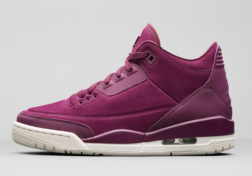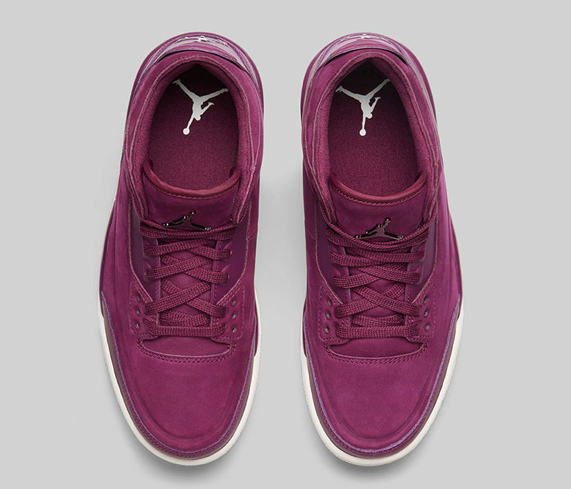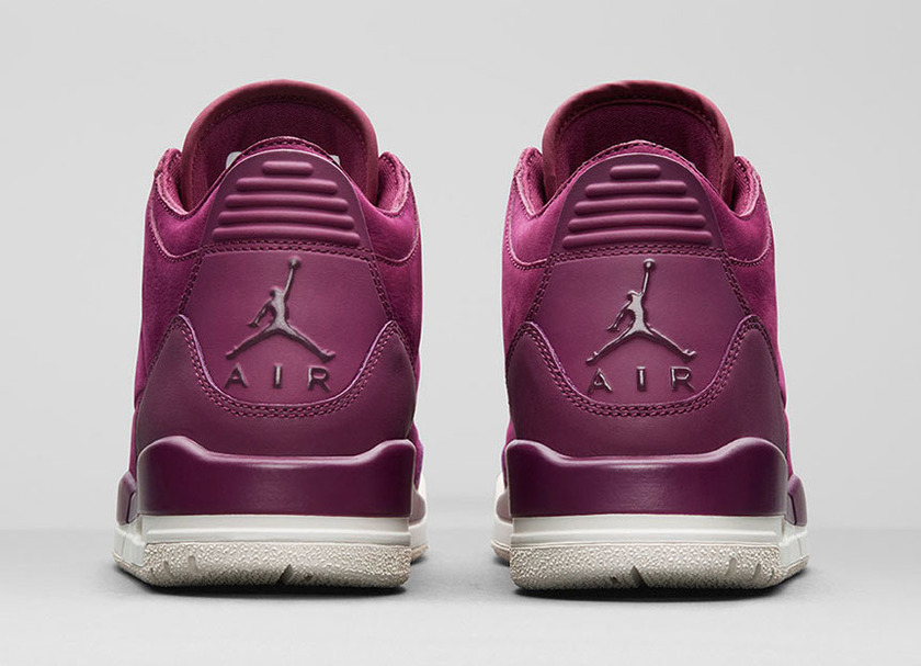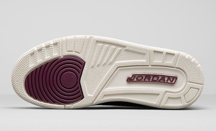 与早先曝光的假想图类似,这款 Air Jordan 3 “Bordeaux” 以波尔多红酒为主题理念,鞋面采用红酒色调的牛巴革材质打造。而与 “Particle Beige” 配色一样,这款红酒主题配色同样舍弃了经典的爆裂纹设计。鞋舌 Jumpman Logo 辅以电镀材质点缀,后跟 Jumpman Logo 则以皮革包裹,以此呈现不同细节感受。