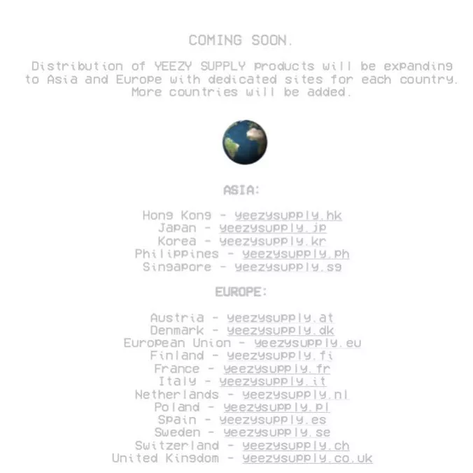 最近,爆料账户@YeezyMafia又带来新的猛料,透露了YeezySupply官网将会在全球范围开设超多的官网地区,独立的配送,肯定也会有独立的定价!