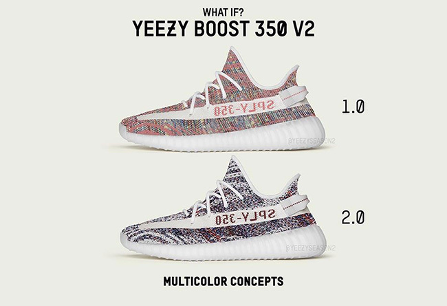 近日,爆料账户@Yeezyseason2晒出一张效果图,其中有两款Yeezy Boost 350v2 全新多彩配色! 不过看到最顶上的“What If”字样,就知道是假想的啦!从图中可以看出,多彩配色分为两个不同版本,都是以多彩的编织鞋面搭配白色主体,而两者的区别在于 1.0 配色更浅更绚丽,2.0 则颜色更深,看上去是在白斑马的基础上添加设计!你觉得如何?