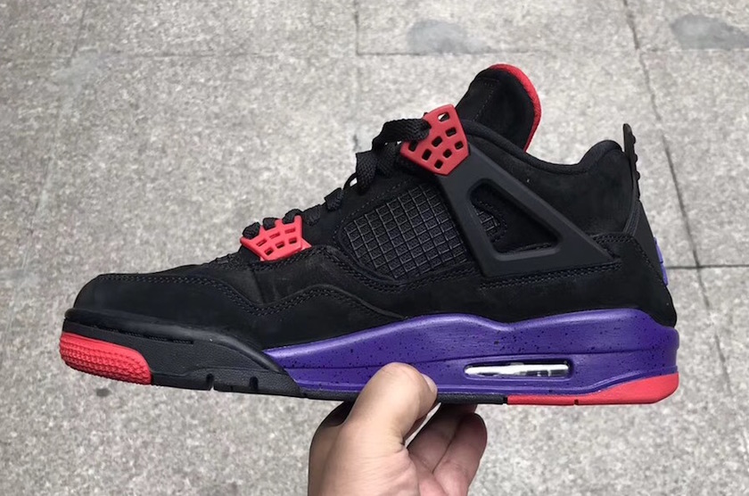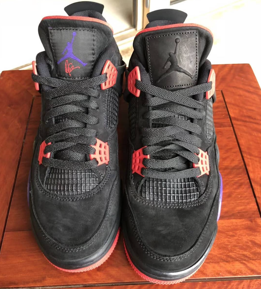 与 Travis Scott 设计联名4代的灵感一样,Drake 同样采用家乡的多伦多猛龙为配色灵感。鞋款采用类似 Air Jordan 7 猛龙的配色方案,采用黑色麂皮鞋面搭配紫、红二色细节,质感颜值双双在线。