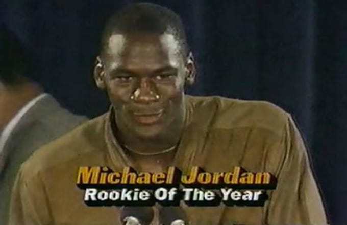 1985年4月30日,乔丹获得 NBA 最佳年度新秀的殊荣。在这一个赛季中,乔丹以28.2分的高分带领芝加哥公牛闯入季后赛。而这款全新的 Air Jordan 1 “Rookie of the Year” 便是以此为主题诞生的。虽只有假想图流出,可以确定的是鞋款将以黑、白、棕三色组成,其中棕色源自当时乔丹上台演讲的服装颜色。