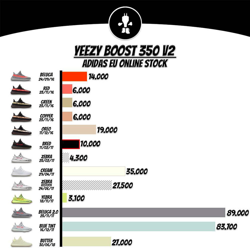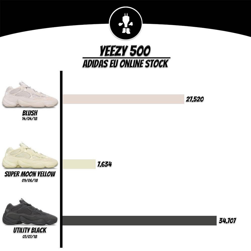 ins账号 @pluggi_de 近期公布了 adidas 欧洲官网的发售货量,其中包含 Yeezy 350 Boost V2 和 Yeezy 500两款鞋型,既有最近发售的 3 款新品,也囊括了一些早前发售过的配色,让我们可以对整体的货量变化有一个全面的了解。